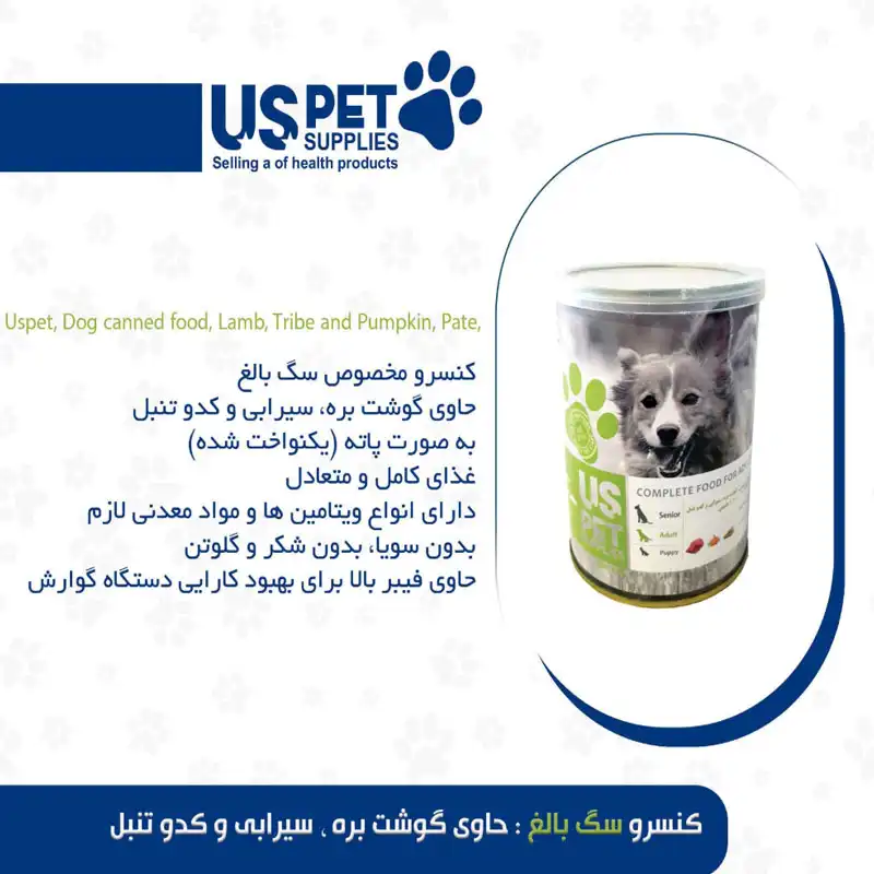 کنسرو 400 گرمی سگ بالغ بره سیرابی و کدو تنبل یو اس پت