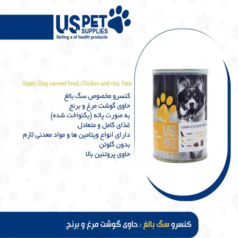 کنسرو 400 گرمی سگ بالغ گوشت مرغ و برنج یو اس پت