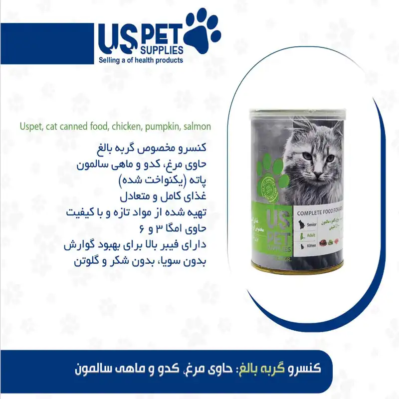 کنسرو 400 گرمی گربه بالغ مرغ کدو و ماهی سالمون یو اس پت