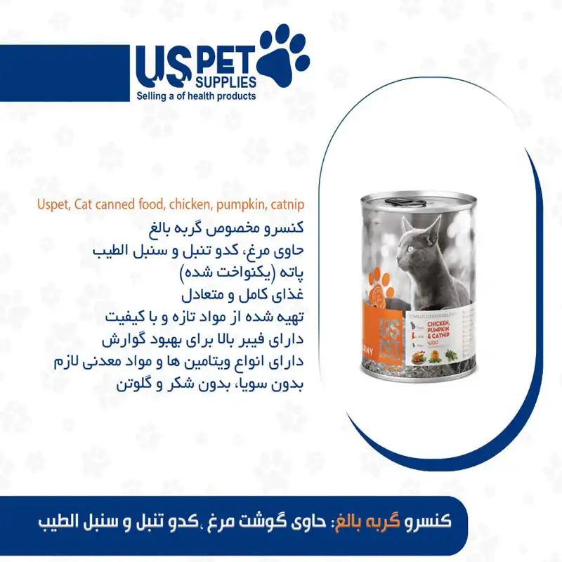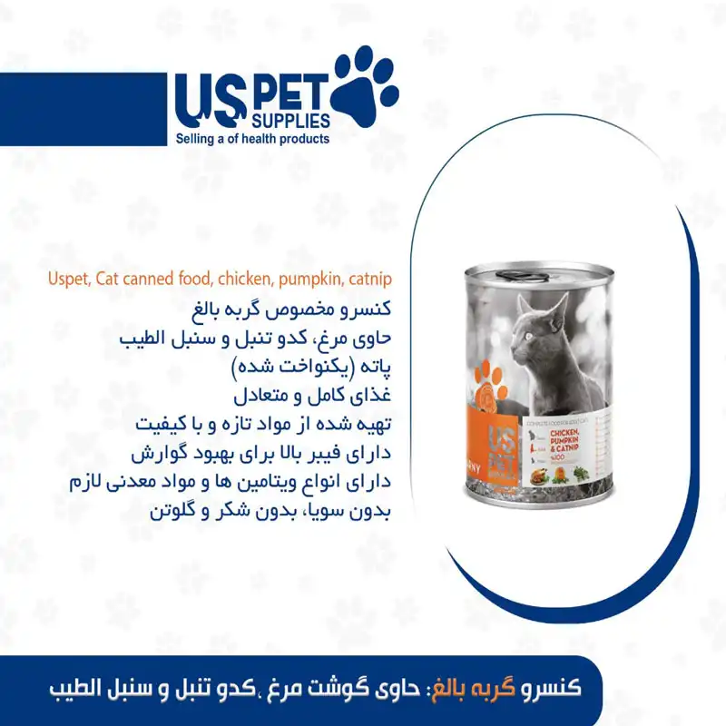 کنسرو ۴۰۰ گرمی گربه بالغ مرغ کدو تنبل و سنبلالطیب یو اس پت